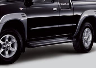 The Frontier comes in Single Cab, King Cab (Extra Cab) and Crew Cab (Double Cab) versions and makes a strong statement with its design. To start off is the two-tone body color that enhances spottiness but the most outstanding feature must be the air scoop. Located on top of the engine compartment lid is an air scoop for the intercooler that cools off hot exhaust used to feed the turbocharger. The Chrome bumper, grille and side view mirrors, as well as large fenders add to the robust look while the interior features a two-tone console, leather upholstery and wood decorations. The wheels are 15-inch alloys wearing 255/70R15 tyres, another element that gives the truck and "off-road" appearance.