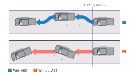 During hard braking and on slippery roads, ABS helps to prevent wheel-lock and maintain steering control.